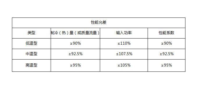 高溫型壓縮機(jī)或壓縮機(jī)組的制冷量、熱量或質(zhì)量流量應(yīng)大于等于95%,輸入功率小于等于105%,性能系數(shù)大于等于95%。